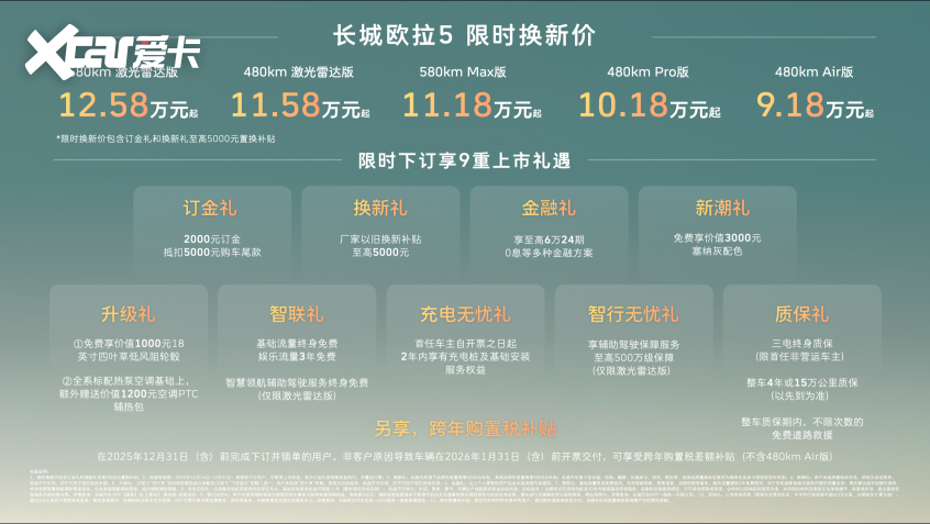 2025年12月16日,长城汽车欧拉品牌全新A级纯电SUV长城欧拉5正式上市。新车共推出5款配置,建议零售价区间为 9.98万至13.38万元,限时换新价9.18万元起(限时换新价包含“订金礼”和“换新礼”至高5000元以旧换新补贴)。为回馈广大新老用户的热爱与支持,即日起至2025年12月31日,用户下订并锁单即可尊享包含订金礼、换新礼、智行无忧礼在内的9重上市好礼,以及跨年购置税补贴(不含480km Air版)等丰厚购车权益。凭借诚意十足的价格权益与越级产品力,长城欧拉5致力于成为全世界年轻用户的“严选搭子”。